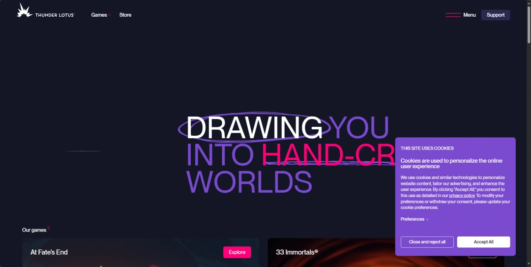 《于命运终焉》(At Fate’s END)是一款由Thunder Lotus制作发行的动作冒险游戏。而这款游戏的官网地址就是一个官网页面,另外Steam平台的购买页面也算官网,进入到这个游戏的购买页