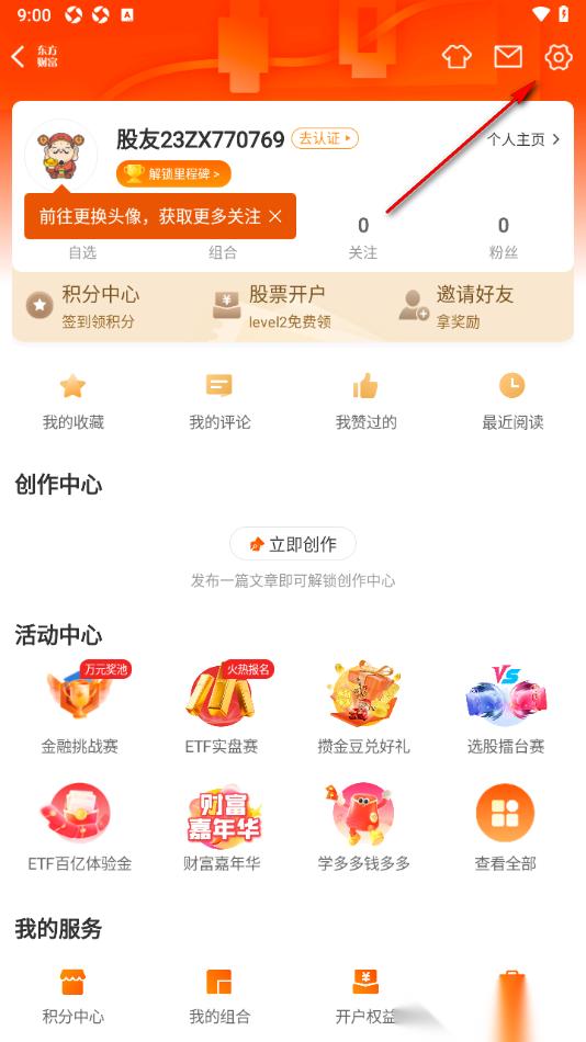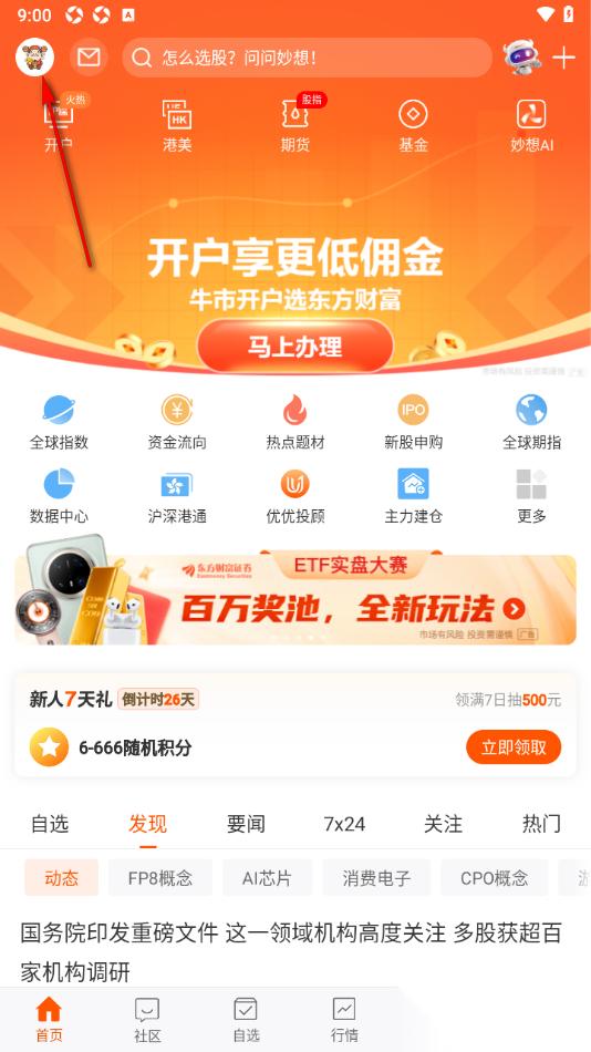 1.当我们进入到东方财富APP这款软件之后,在页面上方的位置选择人像图标按钮,点击打开该选项。