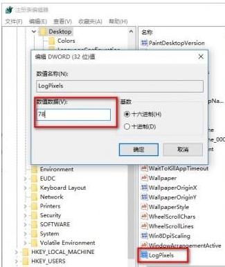 4. 找到LogPixels(如果没有就新建一个“DWORD (32位)值”,命名为LogPixels),将LogPixels修改为所需放大的百分比数值,注意十六进制与十进制的转换(括号内为十进制的放大百分比,括号外为十六进制的放大数值,例如想放大到120%,就填写78):78(120%),7D(125%),96(150%),C8(200%),如下图。