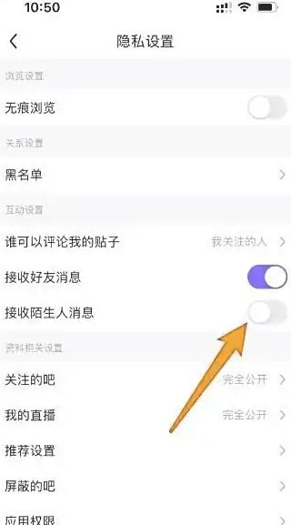 最后,如下,进入隐私设置页面,将【接收陌生人消息】后的按钮关闭即可