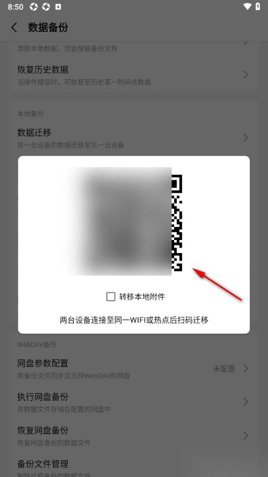 5.那么就需要从旧设备中选择需要迁出的数据文件,再在弹出的窗口中使用新设备扫描二维码即可迁移,需要注意的是两台设备需要连接在同一个WIFI下。