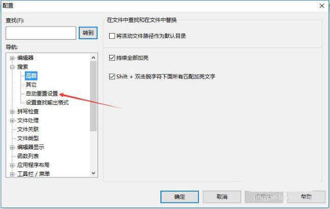 3、在打开的窗口界面中,点击左侧"搜索"中的"自动重置设置"选项。