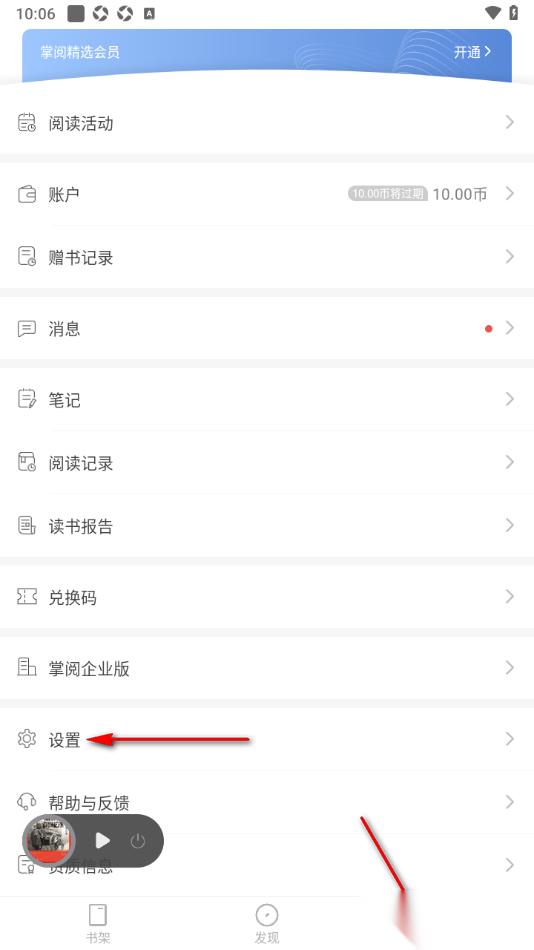 1.直接进入到掌阅精选app这款软件中,在页面下方将我的选项点击打开,再找到【设置】选项,将其点击打开。